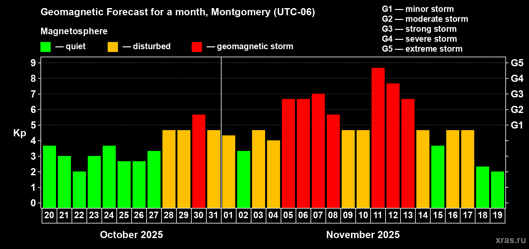 Geomagnetic storm forecast in Montgomery for Oct 20, 2025