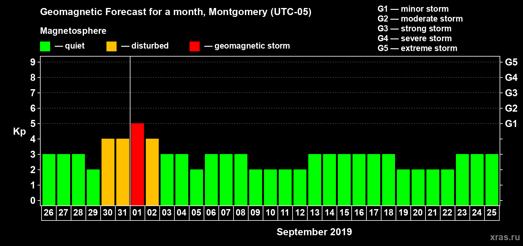 Geomagnetic storm forecast in Montgomery for Aug 26, 2019