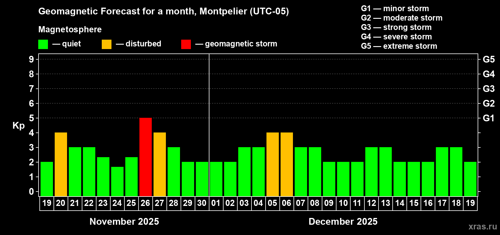 Geomagnetic storm forecast in Montpelier for Nov 19, 2025