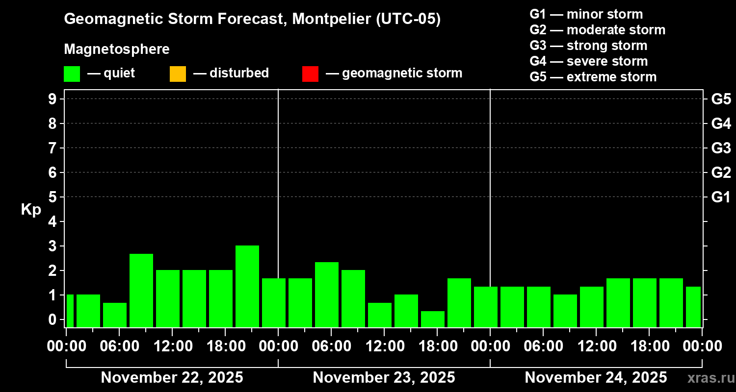 Geomagnetic storm forecast in Montpelier for Nov 22, 2025
