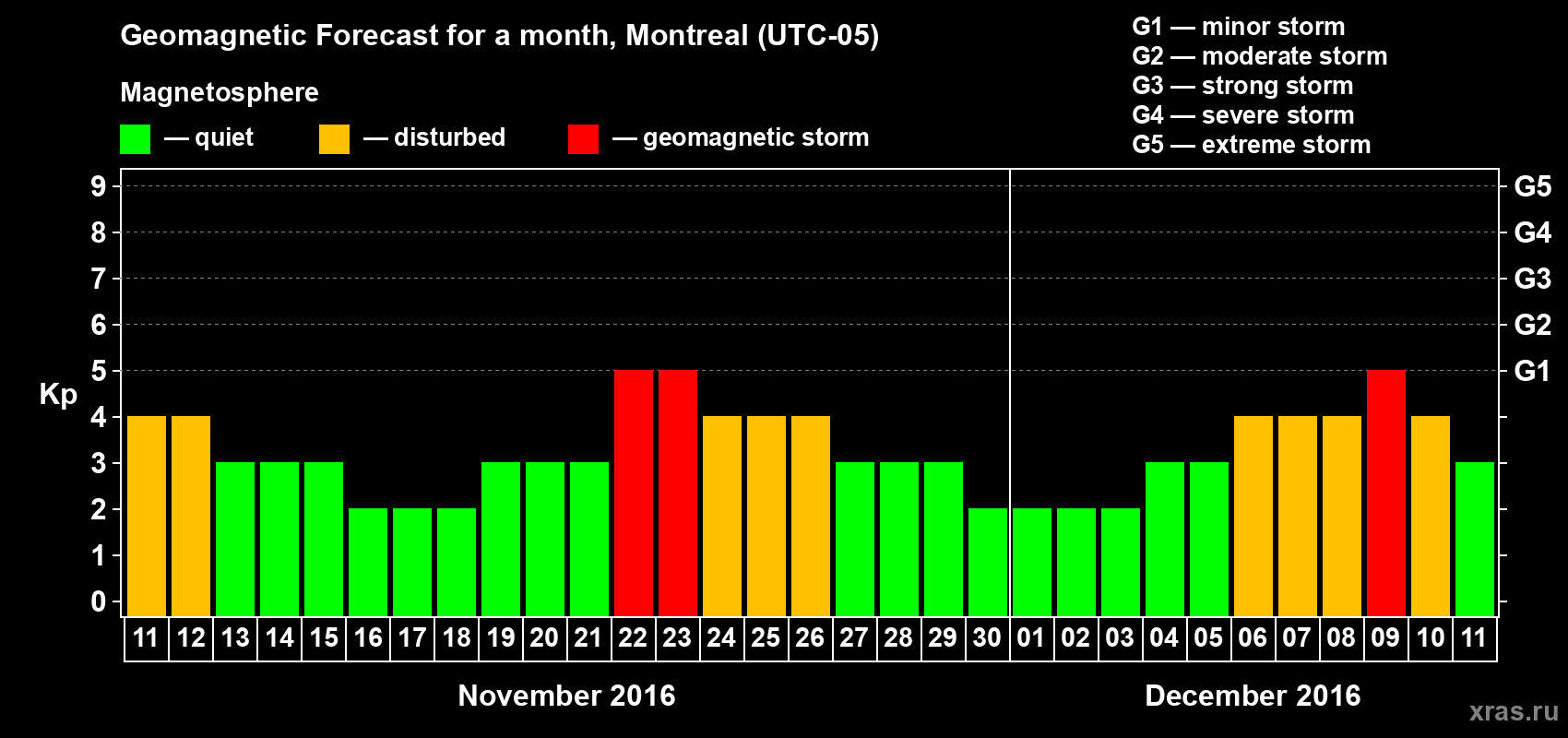 Geomagnetic storm forecast in Montreal for Nov 11, 2016