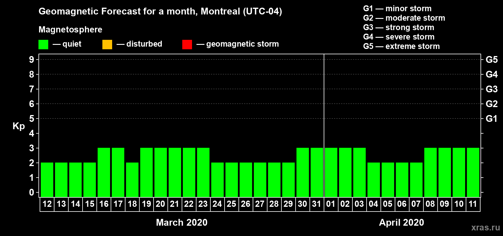 Geomagnetic activity forecast in Montreal — Mar 12, 2020