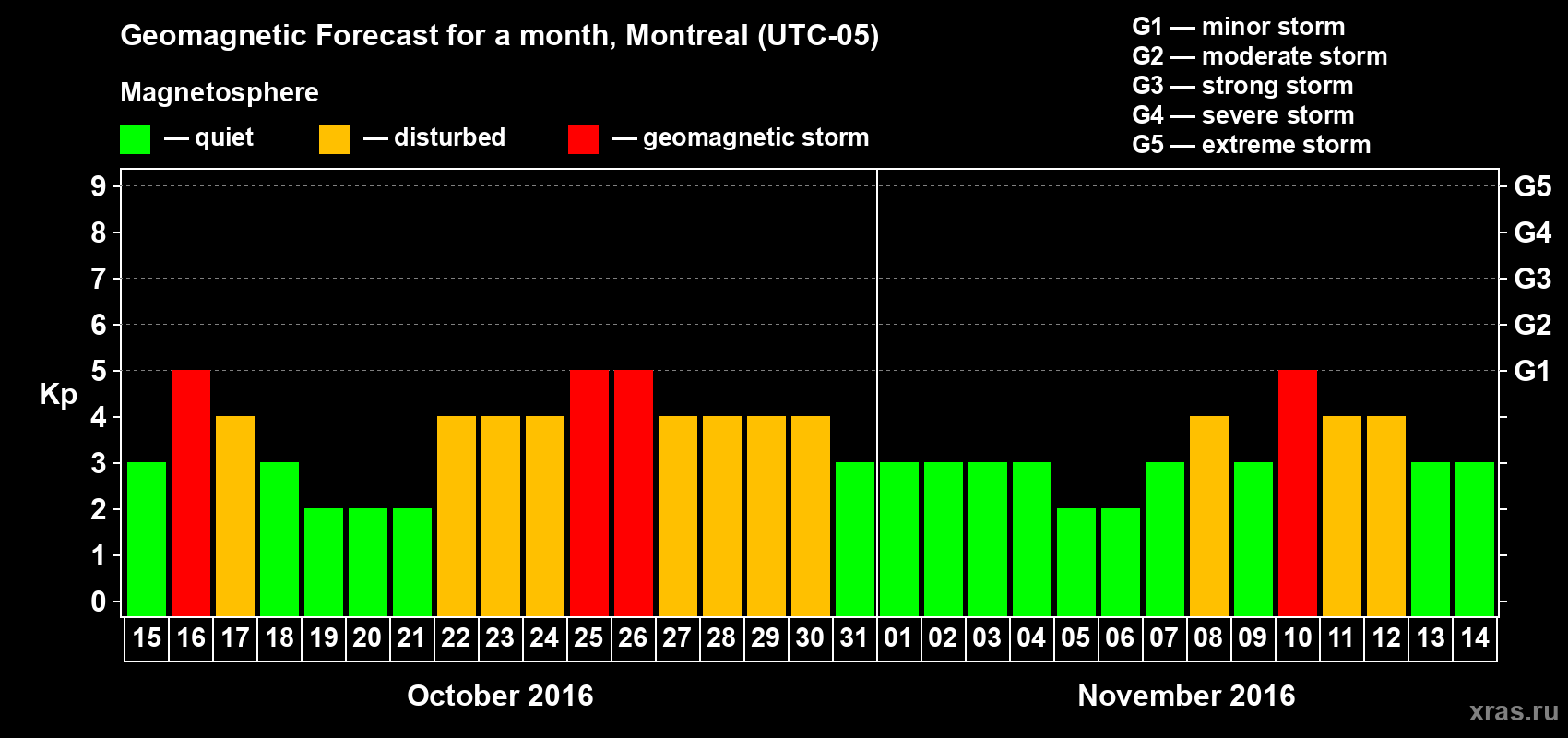 Geomagnetic activity forecast in Montreal — Oct 15, 2016