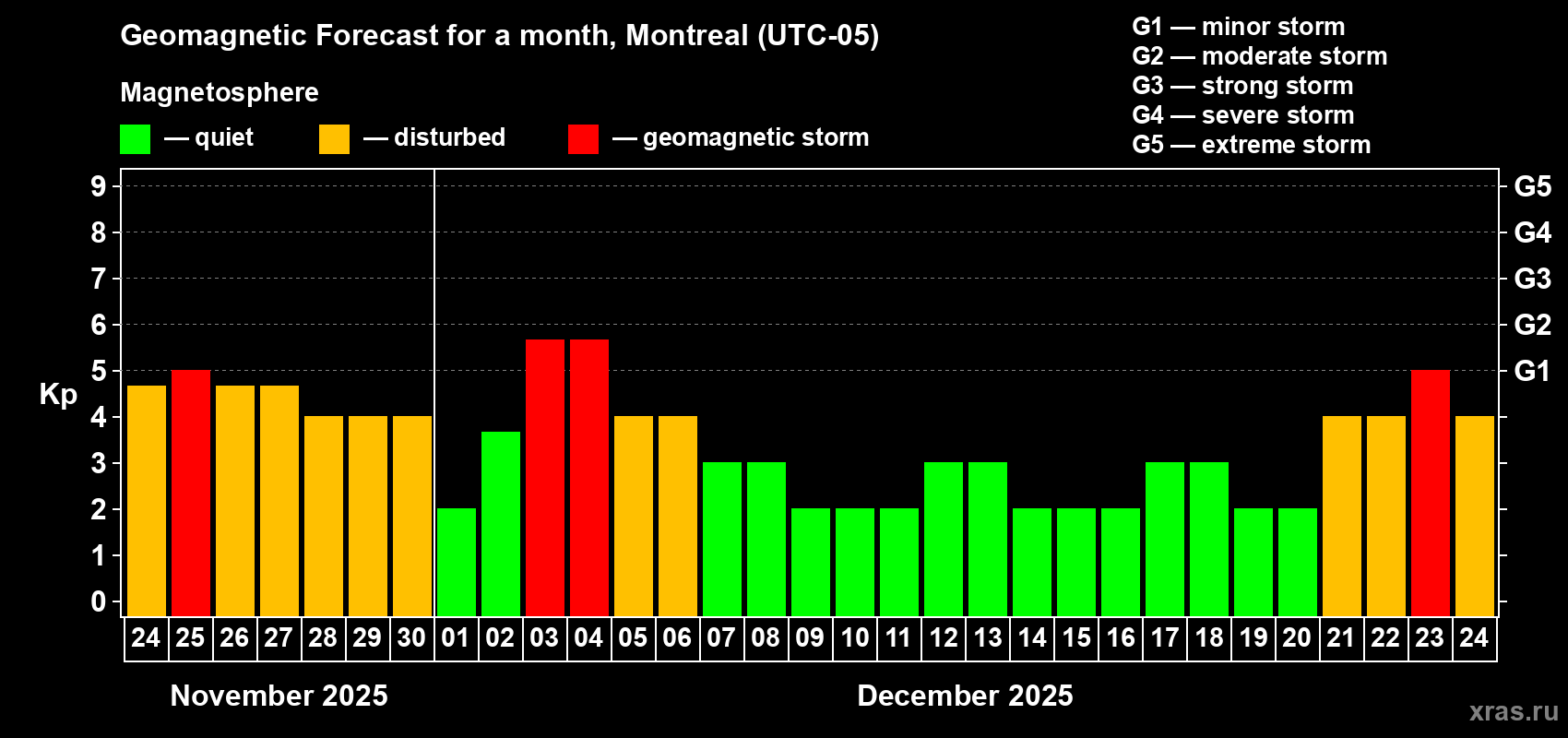 Geomagnetic storm forecast in Montreal for Nov 24, 2025