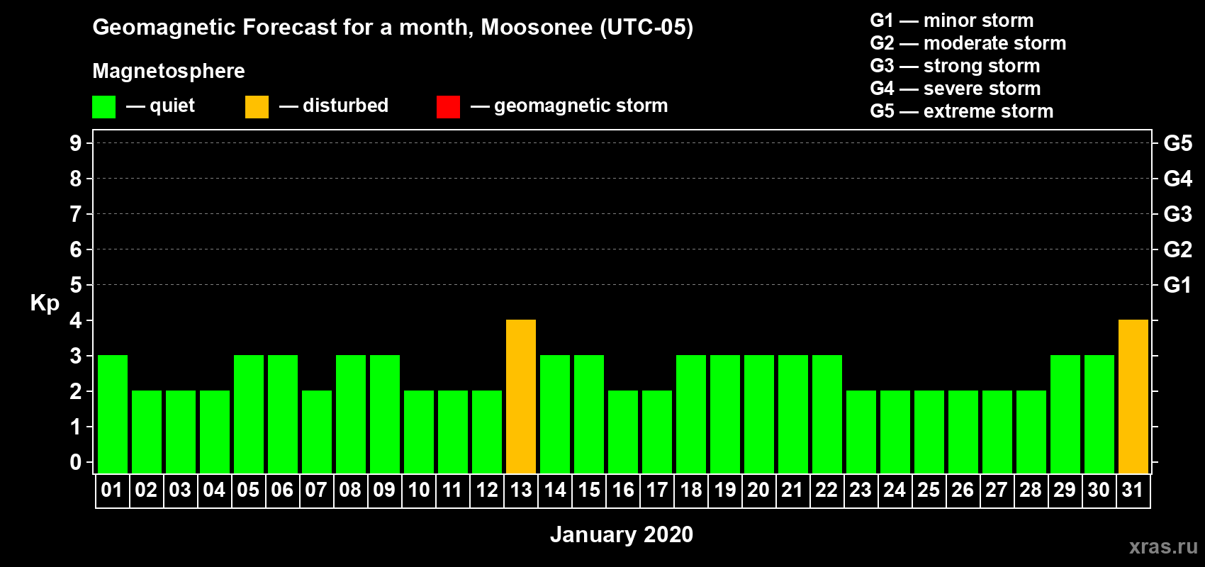 Geomagnetic storm forecast in Moosonee for Jan 01, 2020