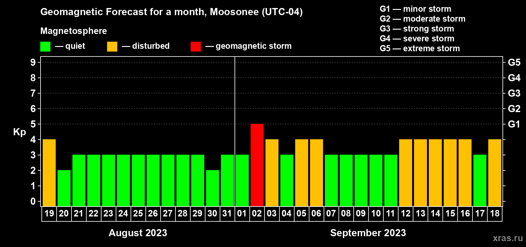 Geomagnetic storm forecast in Moosonee for Aug 19, 2023
