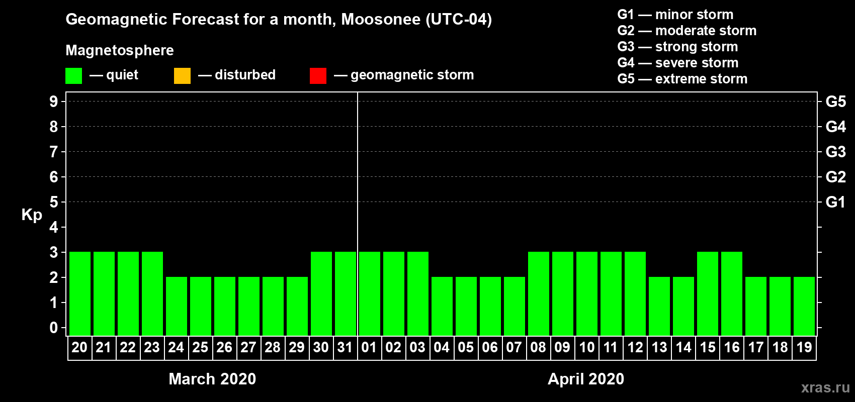 Geomagnetic storm forecast in Moosonee for Mar 20, 2020