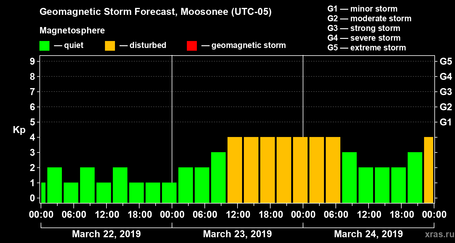 Geomagnetic storm forecast in Moosonee for Mar 22, 2019