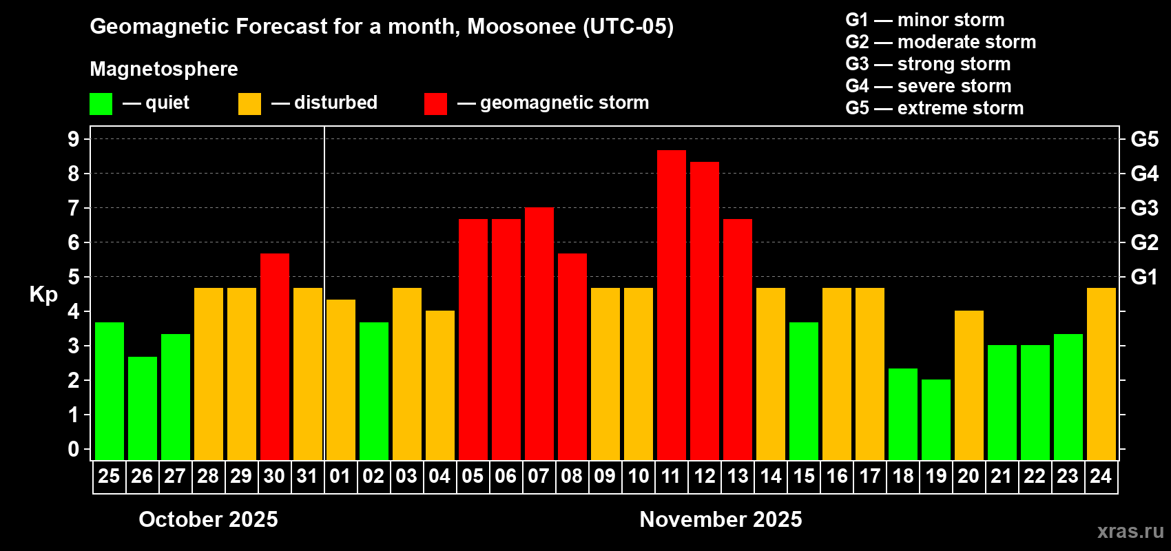 Geomagnetic storm forecast in Moosonee for Oct 25, 2025