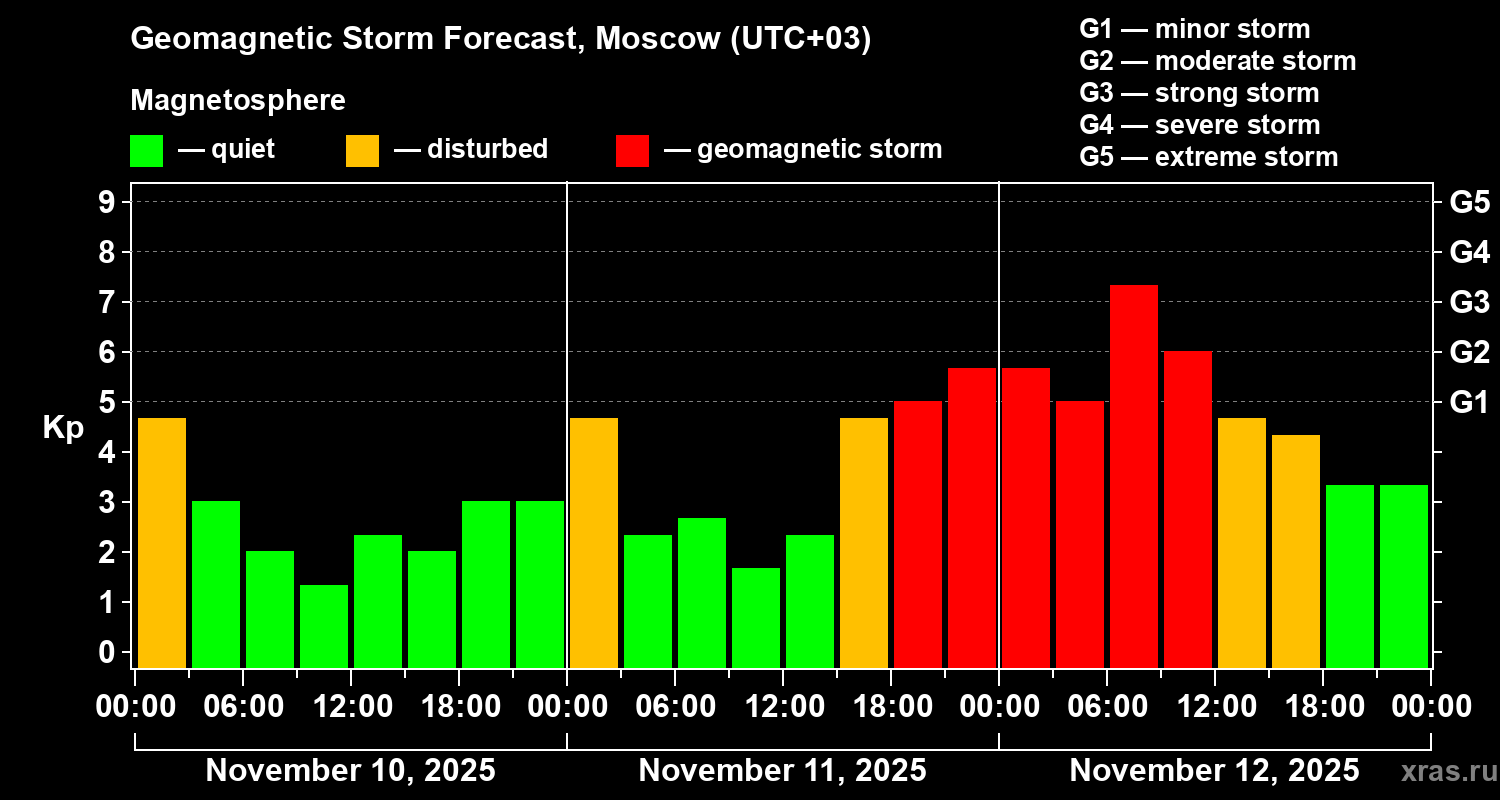 Geomagnetic storm forecast in Moscow for Nov 10, 2025