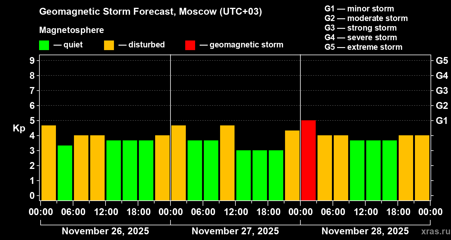 Geomagnetic storm forecast in Moscow for Nov 26, 2025