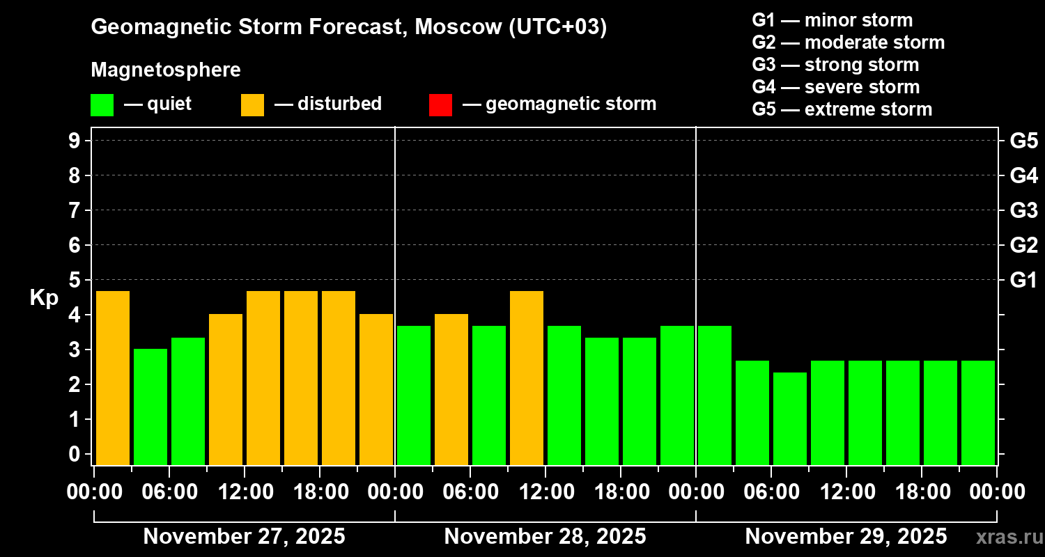 Geomagnetic storm forecast in Moscow for Nov 27, 2025