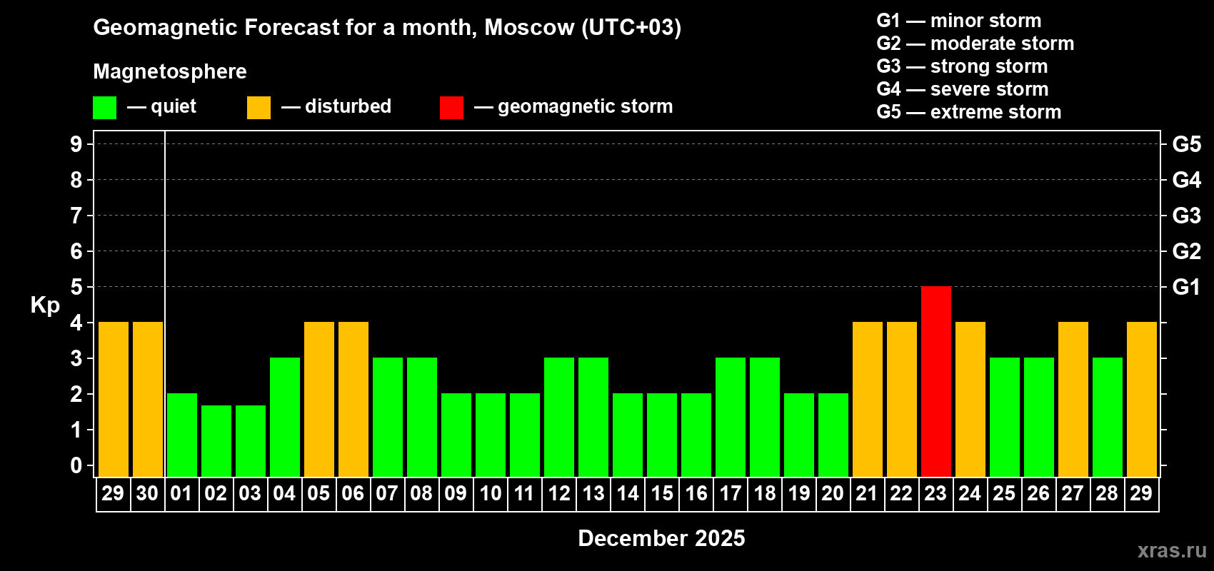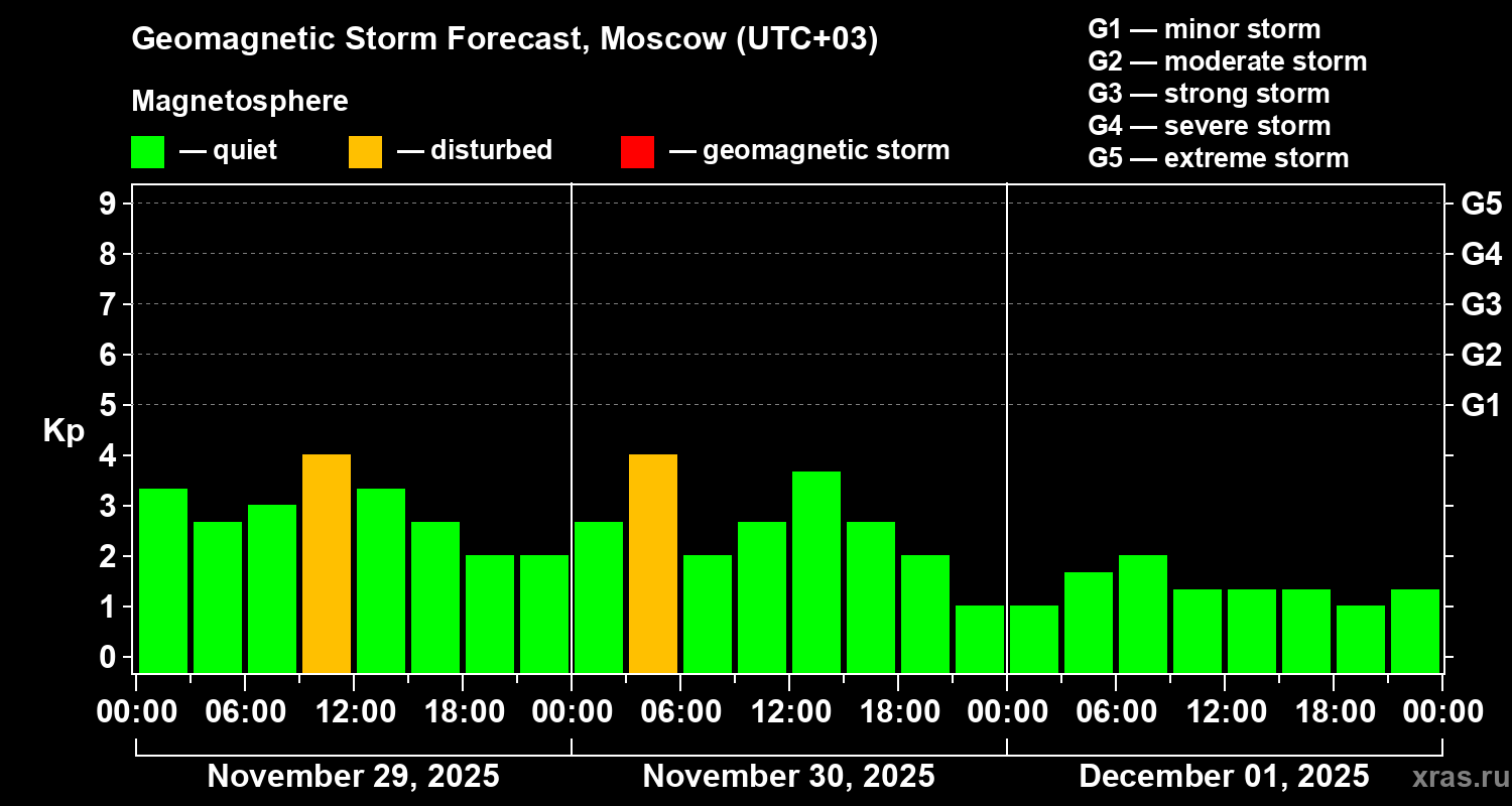 Geomagnetic storm forecast in Moscow for Nov 29, 2025