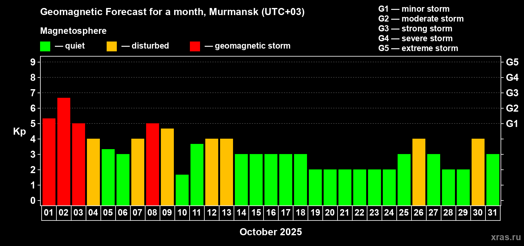 Geomagnetic storm forecast in Murmansk for Oct 01, 2025