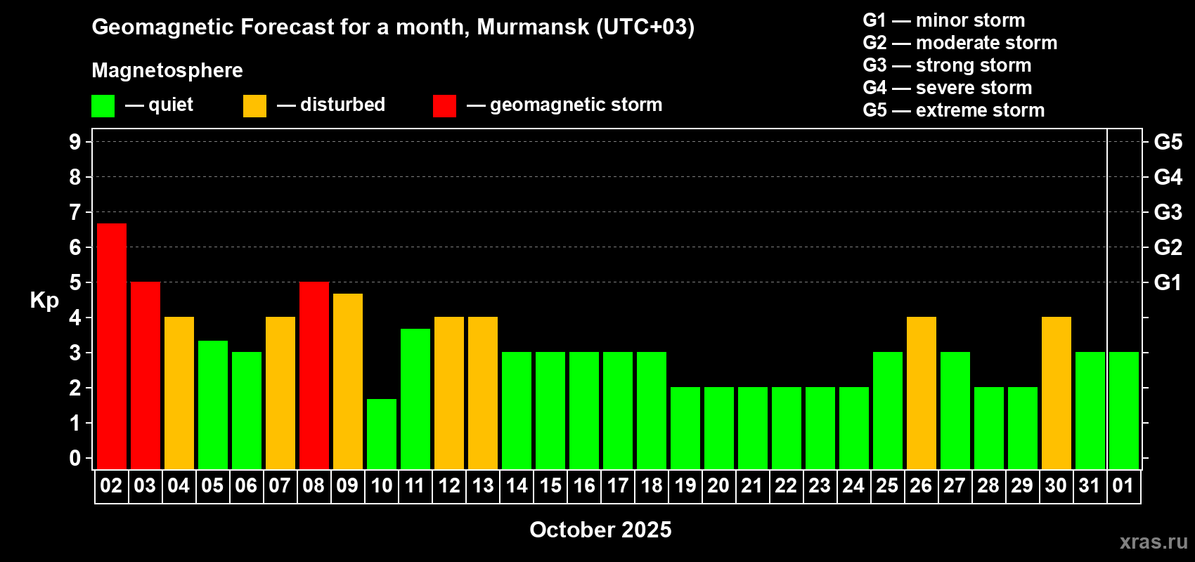 Geomagnetic storm forecast in Murmansk for Oct 02, 2025