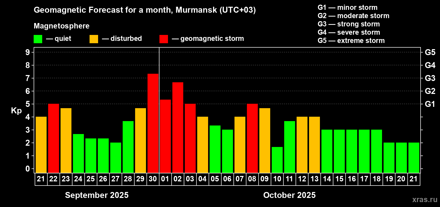 Geomagnetic storm forecast in Murmansk for Sep 21, 2025