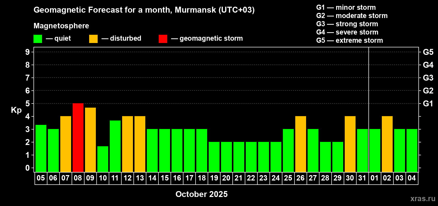Geomagnetic storm forecast in Murmansk for Oct 05, 2025