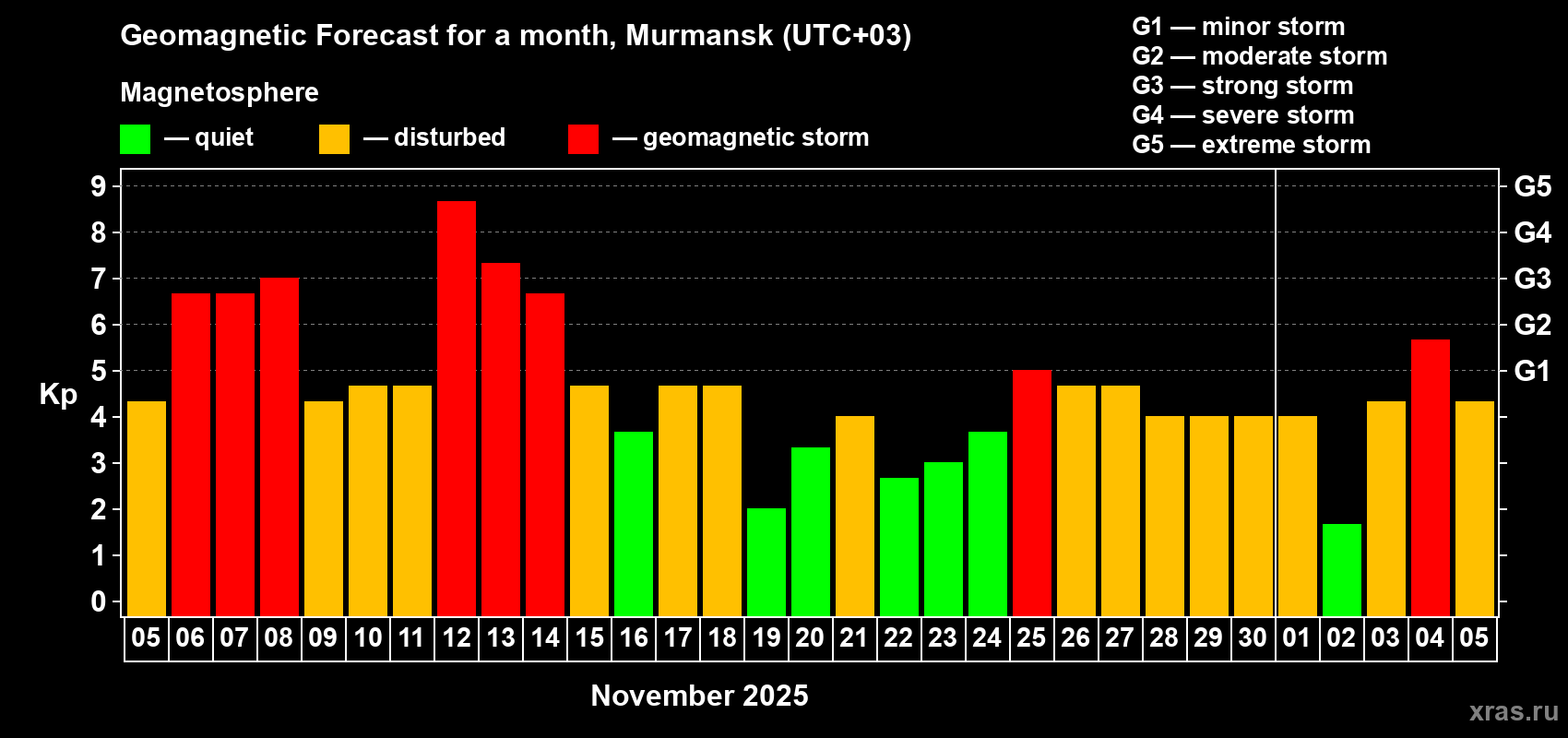 Geomagnetic storm forecast in Murmansk for Nov 05, 2025