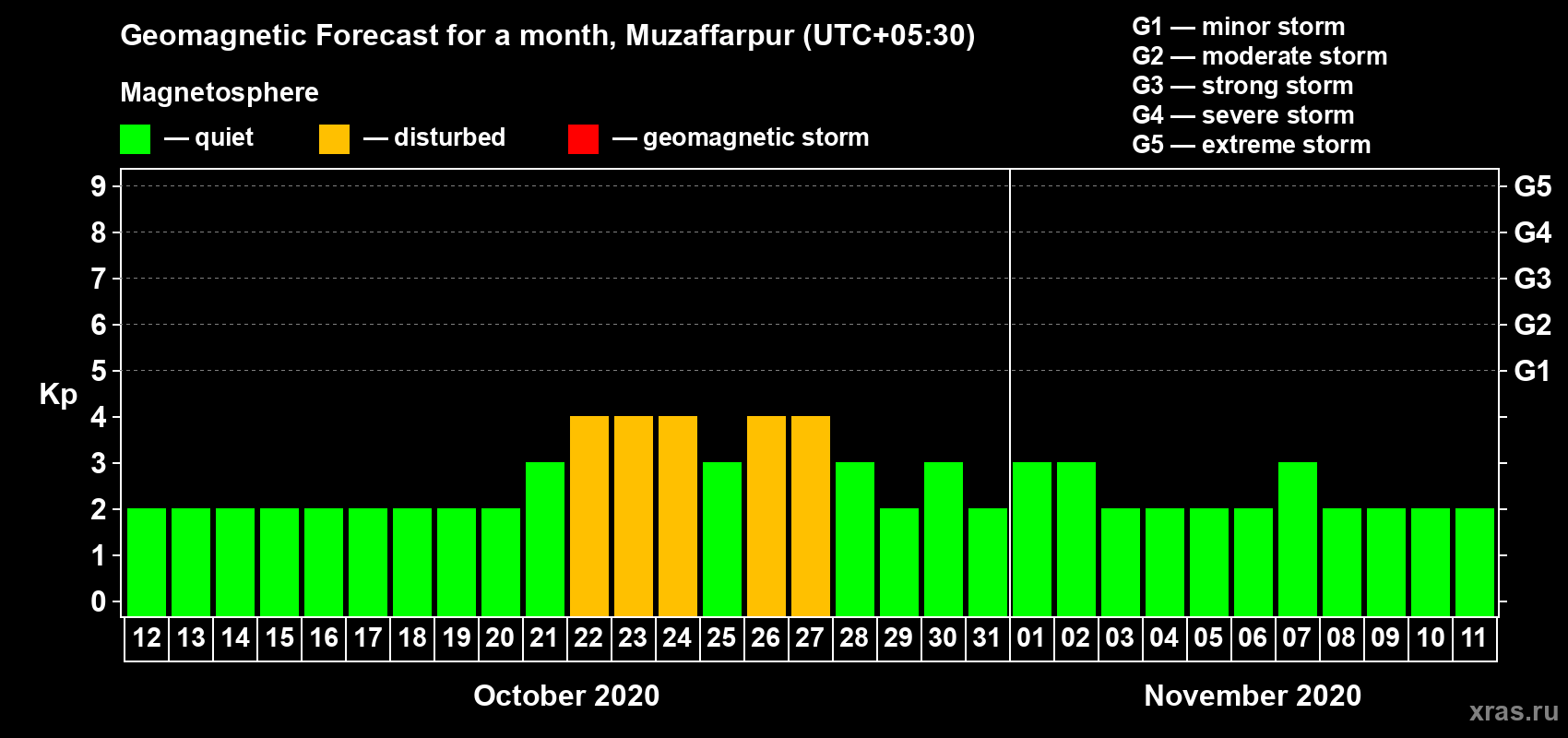 Geomagnetic storm forecast in Muzaffarpur for Oct 12, 2020
