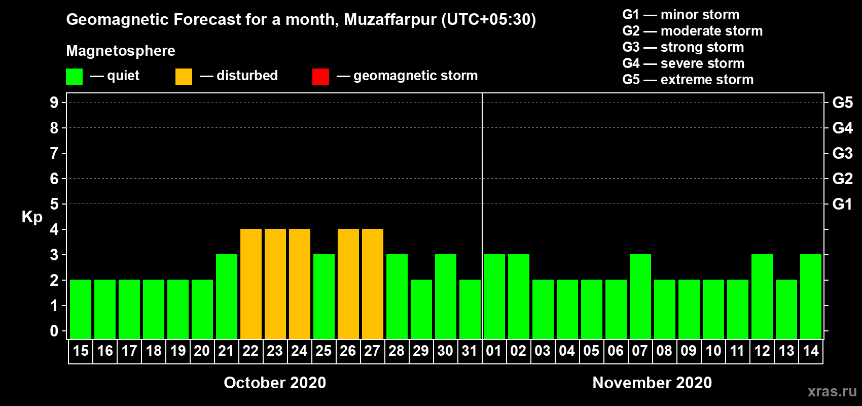 Geomagnetic storm forecast in Muzaffarpur for Oct 15, 2020