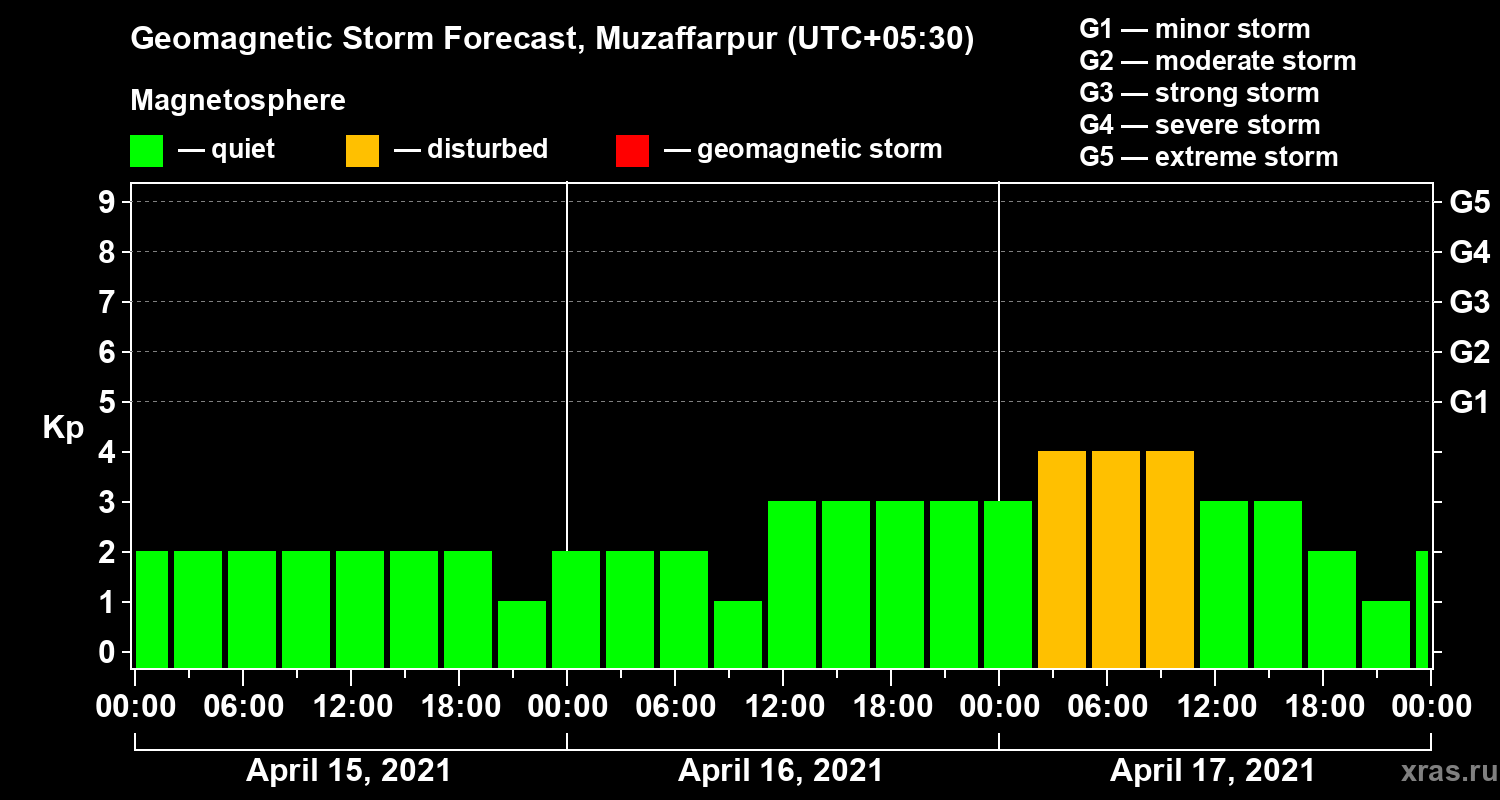 Geomagnetic storm forecast in Muzaffarpur for Apr 15, 2021