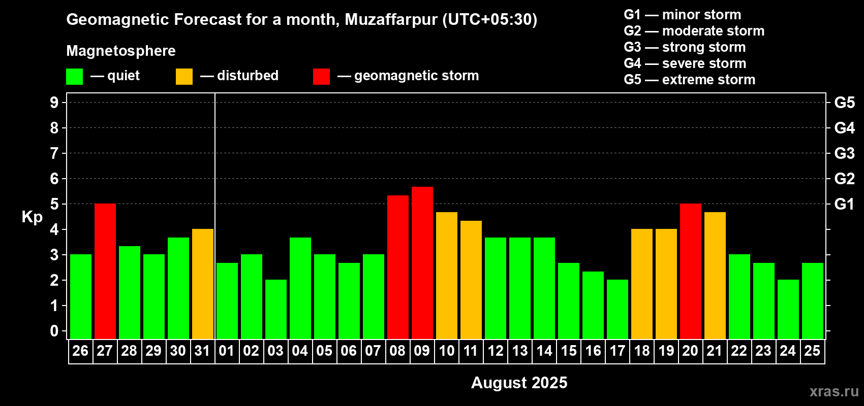 Geomagnetic storm forecast in Muzaffarpur for Jul 26, 2025
