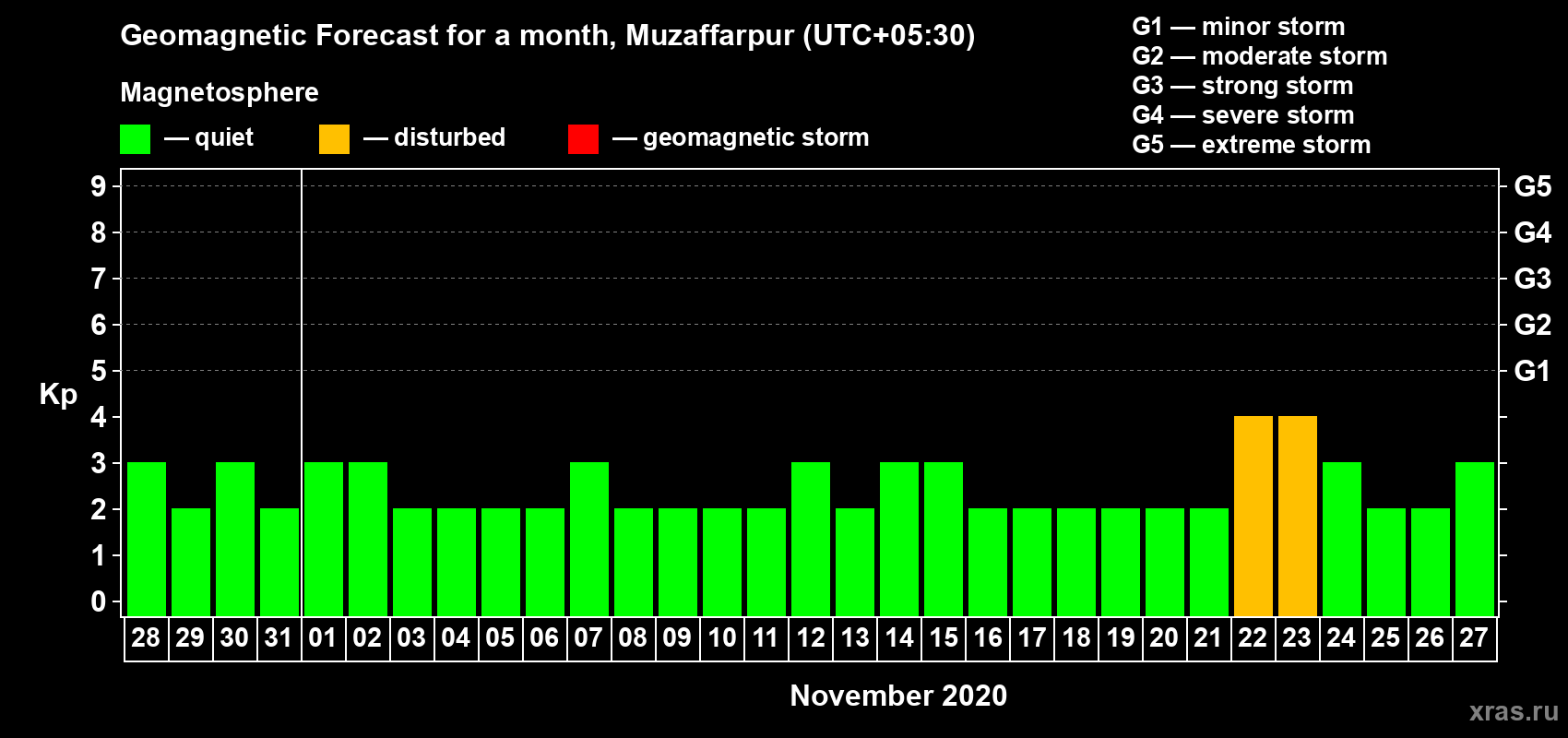 Geomagnetic storm forecast in Muzaffarpur for Oct 28, 2020