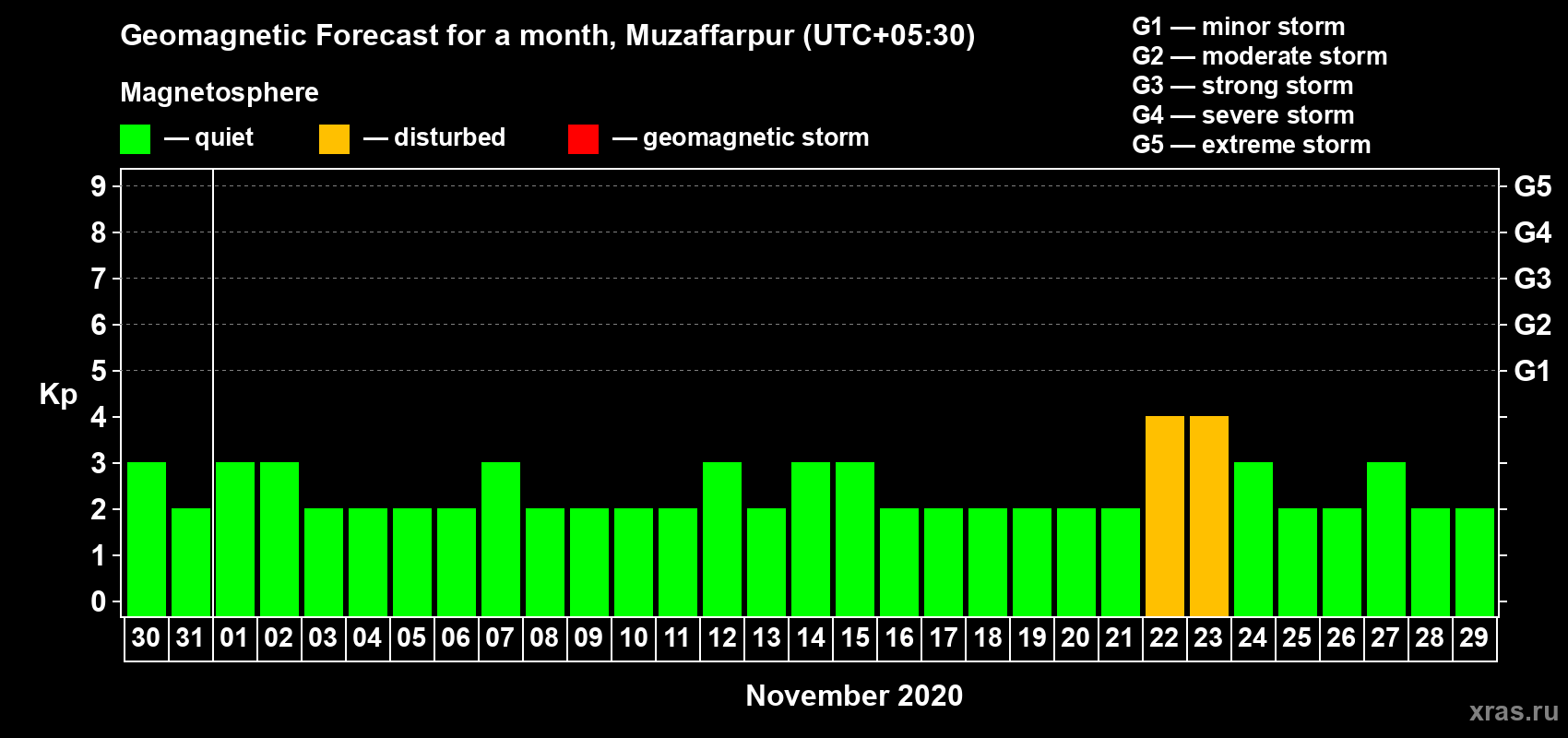 Geomagnetic storm forecast in Muzaffarpur for Oct 30, 2020
