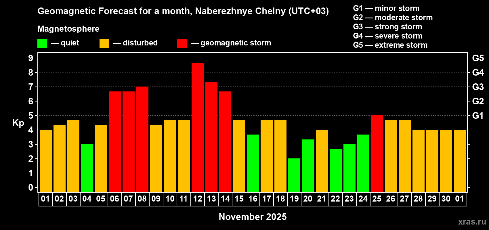 Geomagnetic storm forecast in Naberezhnye Chelny for Nov 01, 2025