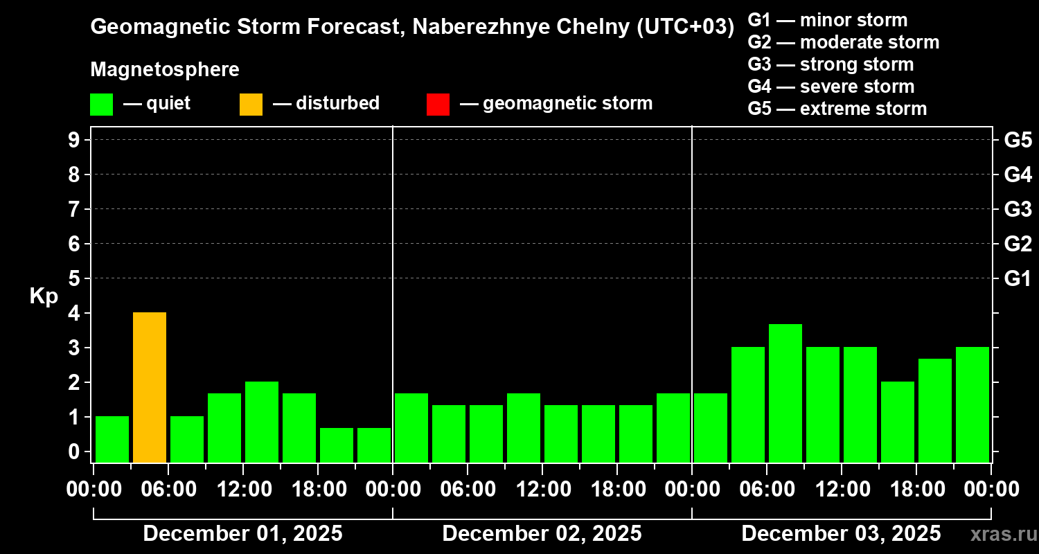 Geomagnetic activity forecast in Naberezhnye Chelny — Dec 01, 2025
