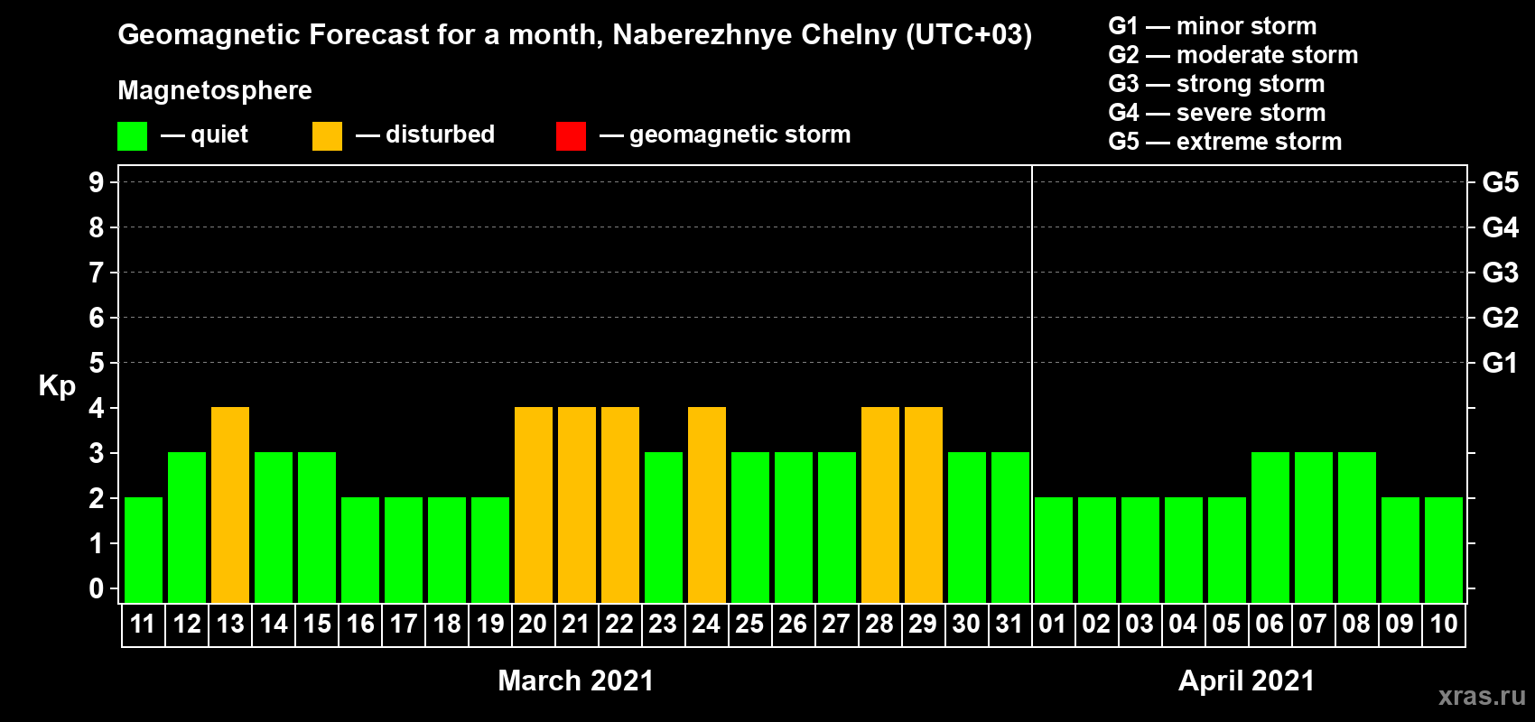 Geomagnetic activity forecast in Naberezhnye Chelny — Mar 11, 2021