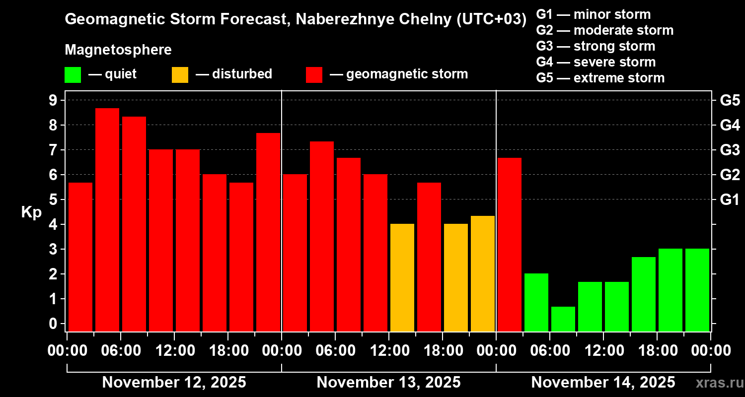 Geomagnetic activity forecast in Naberezhnye Chelny — Nov 12, 2025