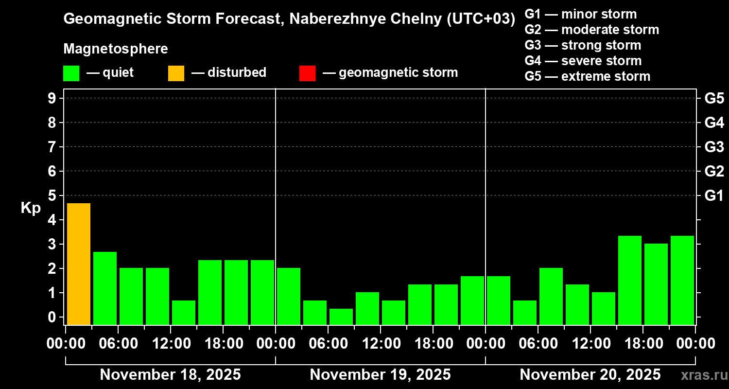Geomagnetic activity forecast in Naberezhnye Chelny — Nov 18, 2025