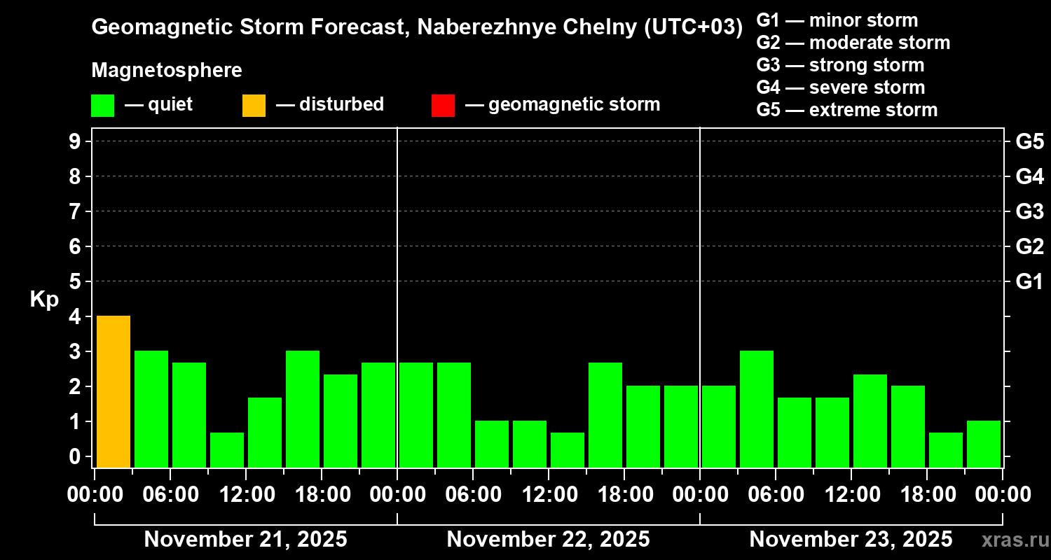 Geomagnetic storm forecast in Naberezhnye Chelny for Nov 21, 2025