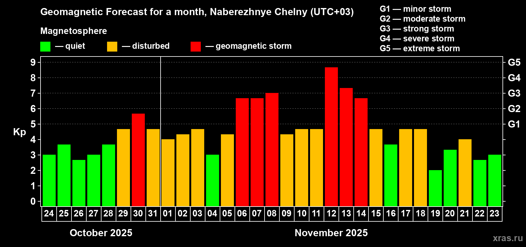 Geomagnetic storm forecast in Naberezhnye Chelny for Oct 24, 2025
