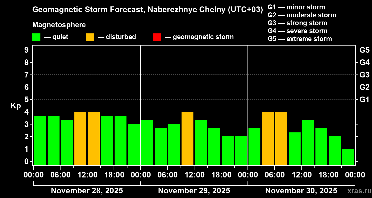 Geomagnetic activity forecast in Naberezhnye Chelny — Nov 28, 2025