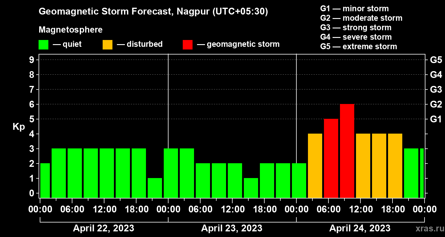 Geomagnetic storm forecast in Nagpur for Apr 22, 2023