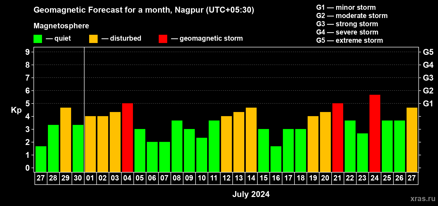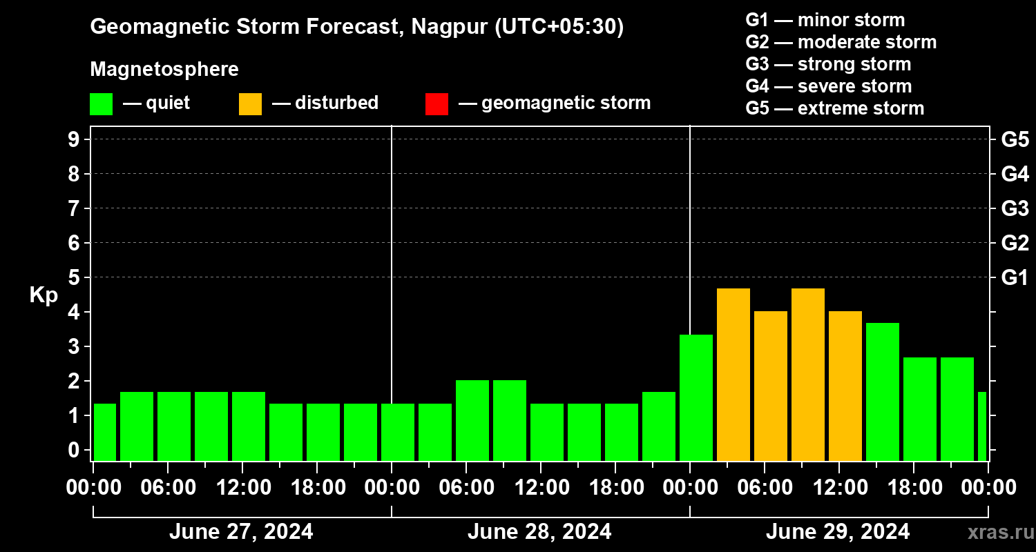 Geomagnetic storm forecast in Nagpur for Jun 27, 2024