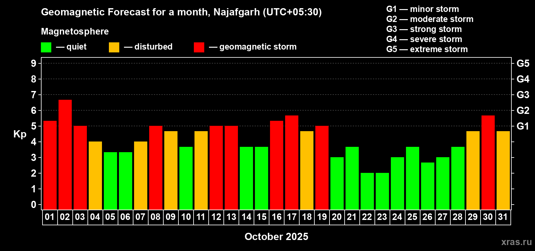 Geomagnetic storm forecast in Najafgarh for Oct 01, 2025