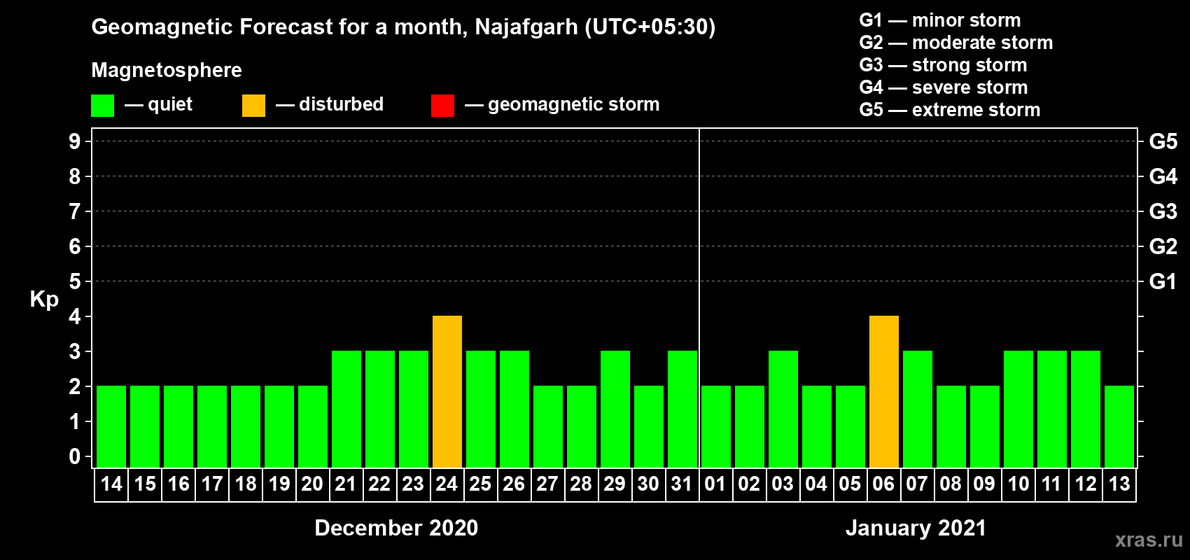 Geomagnetic storm forecast in Najafgarh for Dec 14, 2020