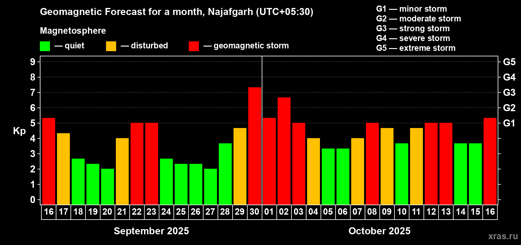 Geomagnetic storm forecast in Najafgarh for Sep 16, 2025