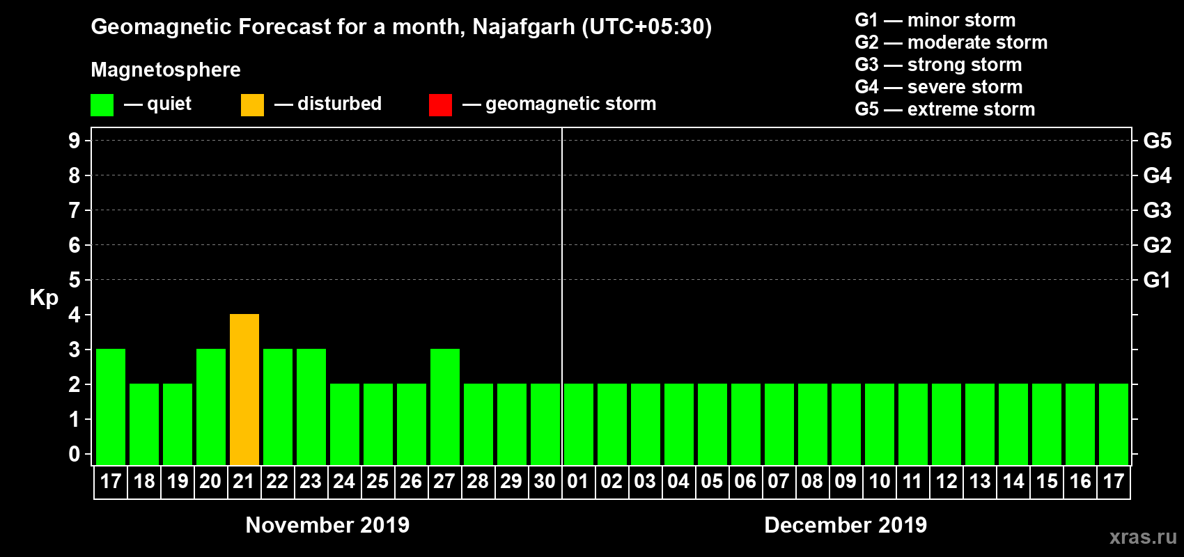 Geomagnetic storm forecast in Najafgarh for Nov 17, 2019