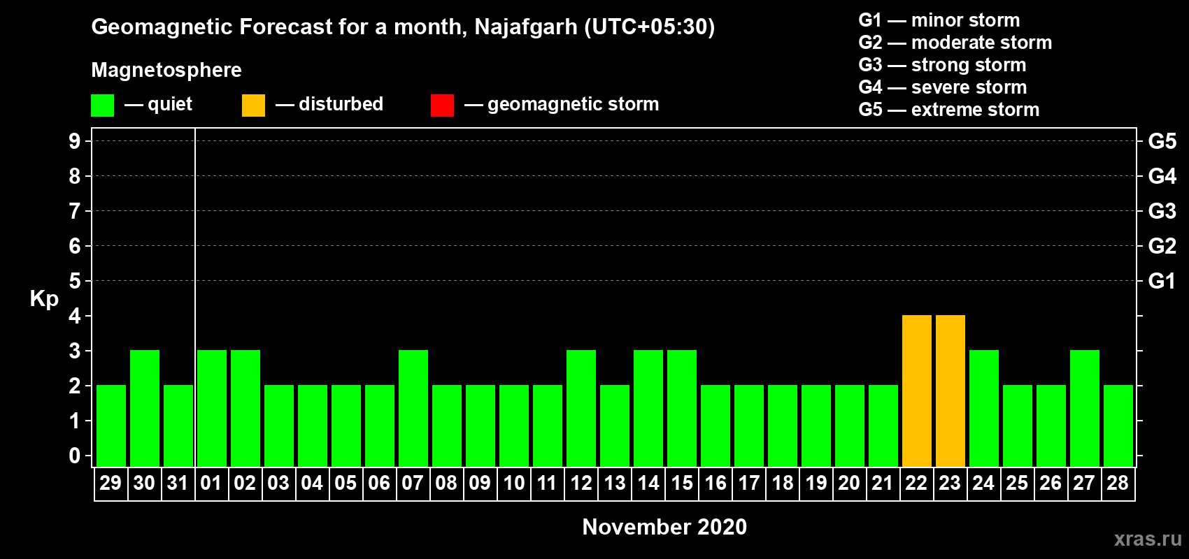 Geomagnetic storm forecast in Najafgarh for Oct 29, 2020