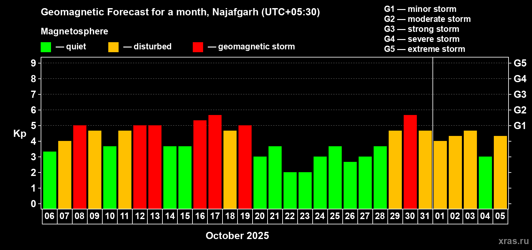 Geomagnetic storm forecast in Najafgarh for Oct 06, 2025