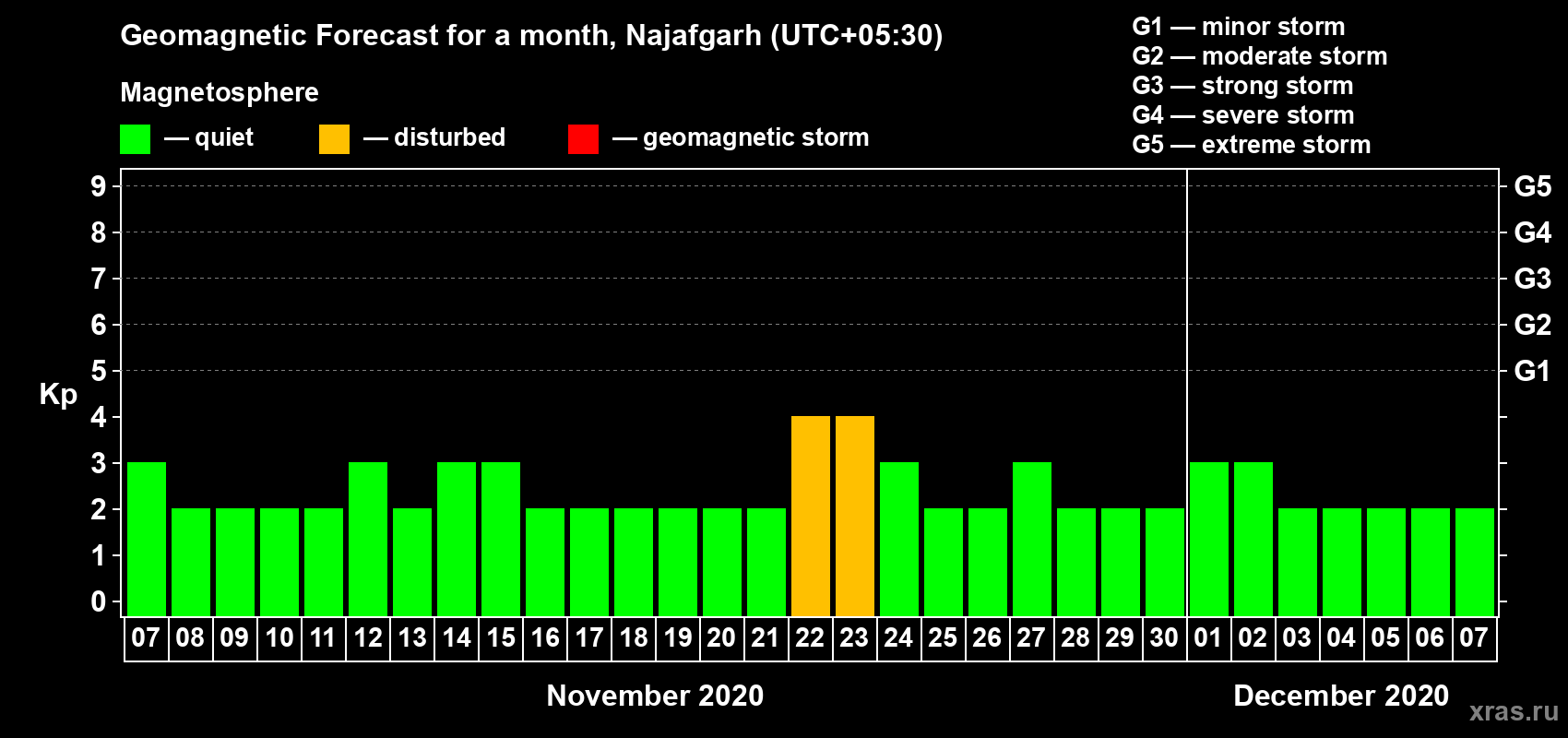 Geomagnetic storm forecast in Najafgarh for Nov 07, 2020