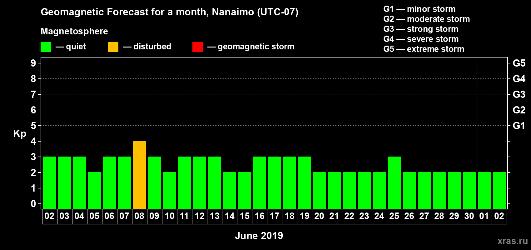 Geomagnetic storm forecast in Nanaimo for Jun 02, 2019