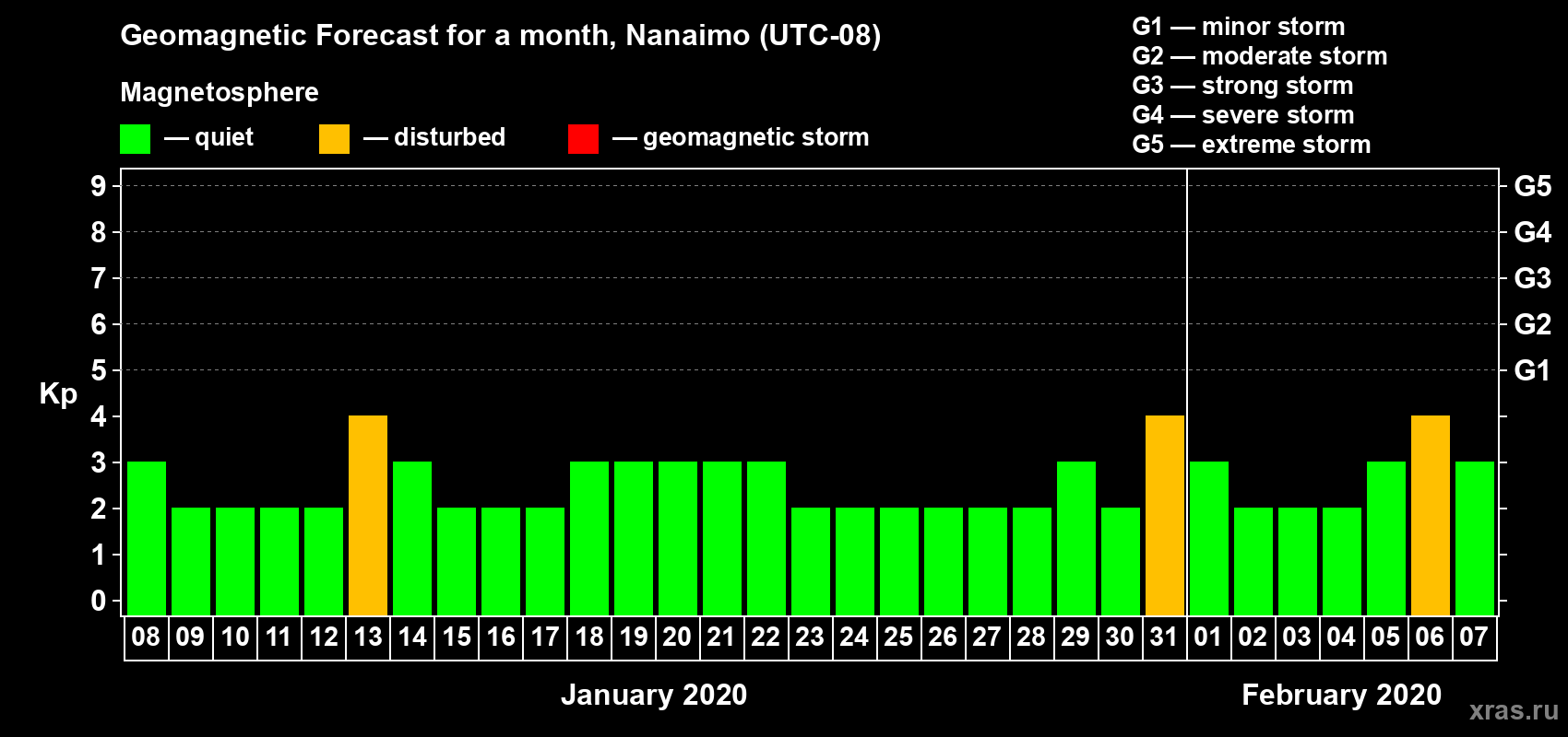 Geomagnetic storm forecast in Nanaimo for Jan 08, 2020