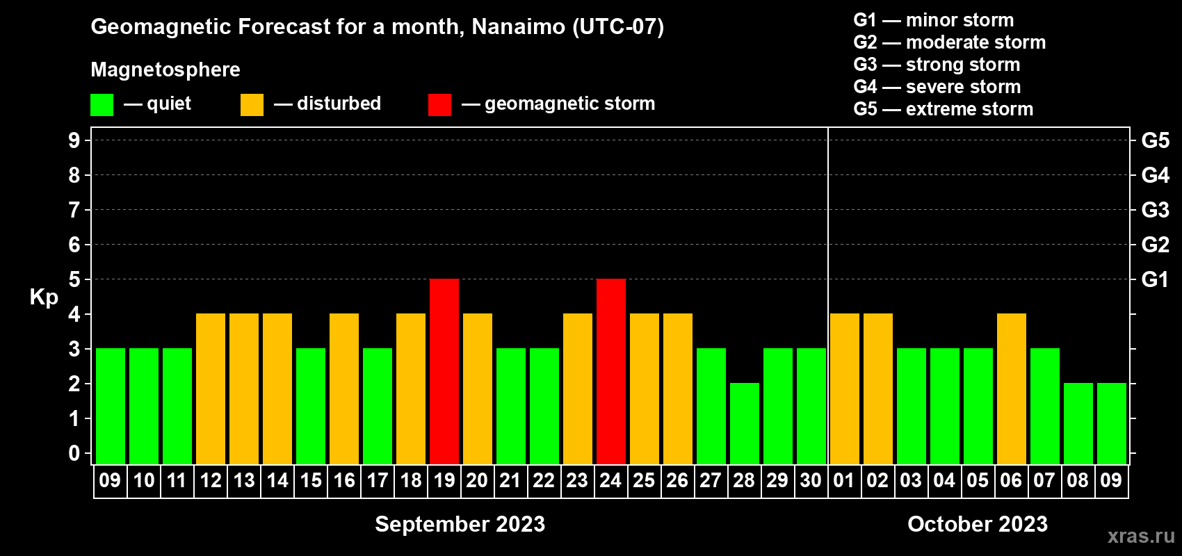 Geomagnetic storm forecast in Nanaimo for Sep 09, 2023