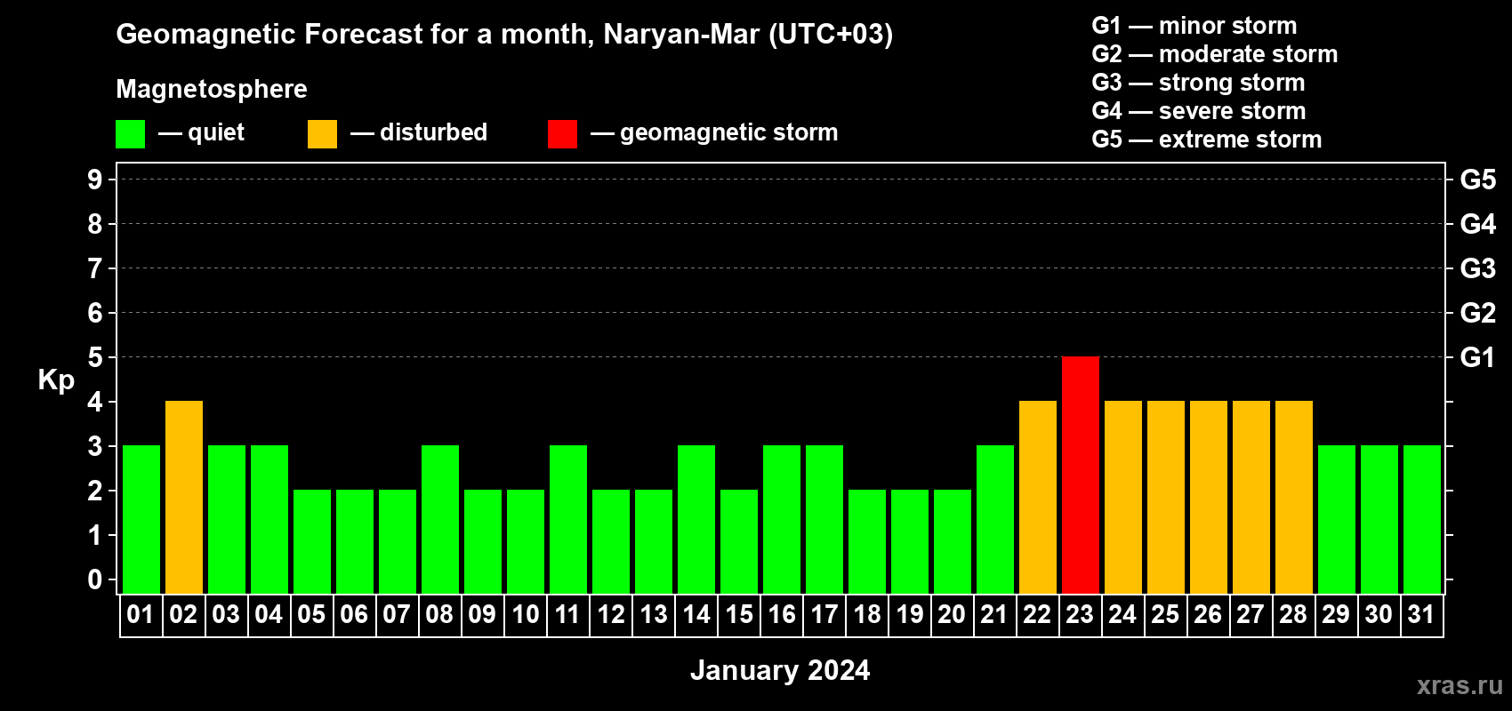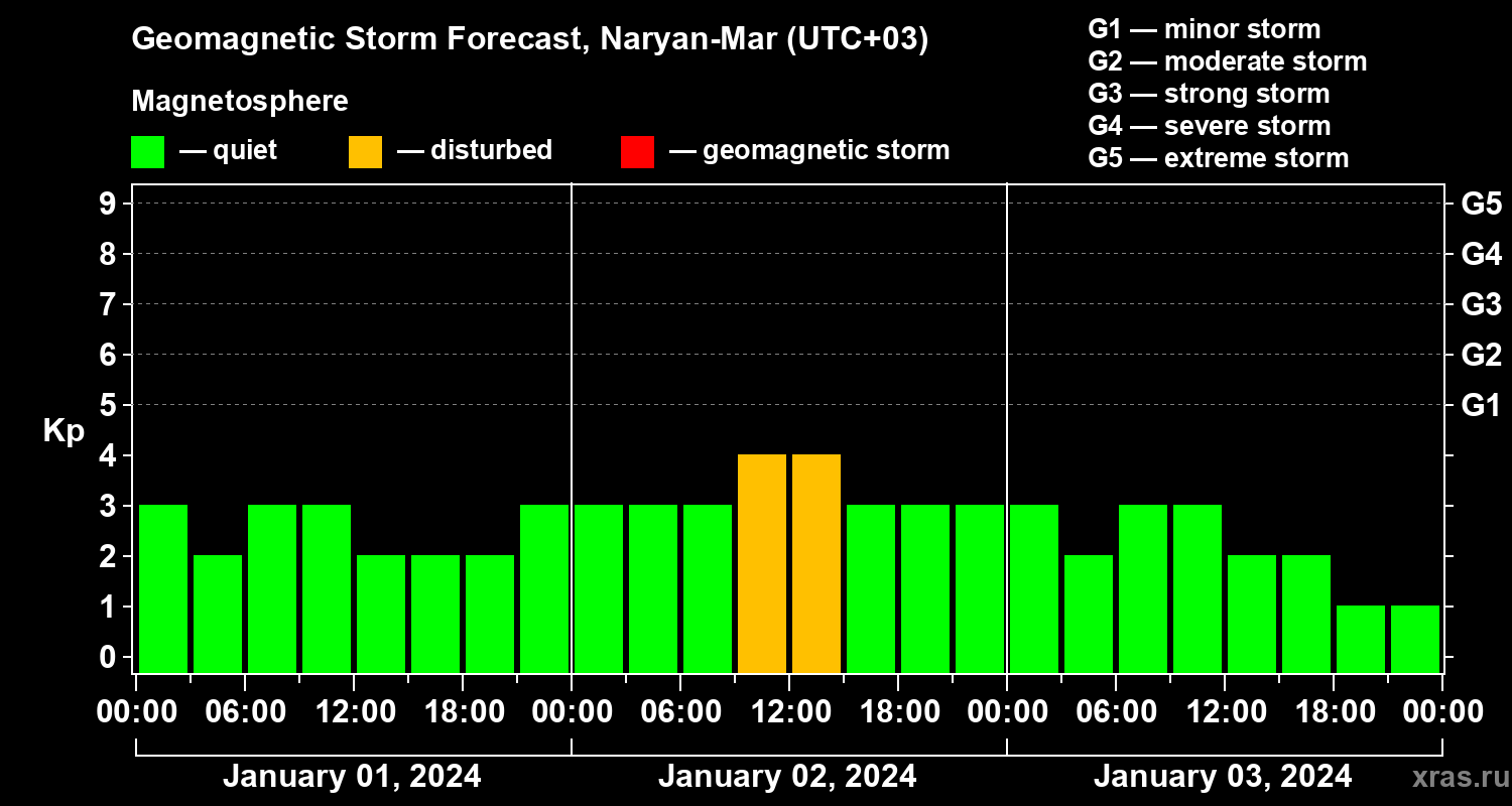 Geomagnetic storm forecast in Naryan-Mar for Jan 01, 2024