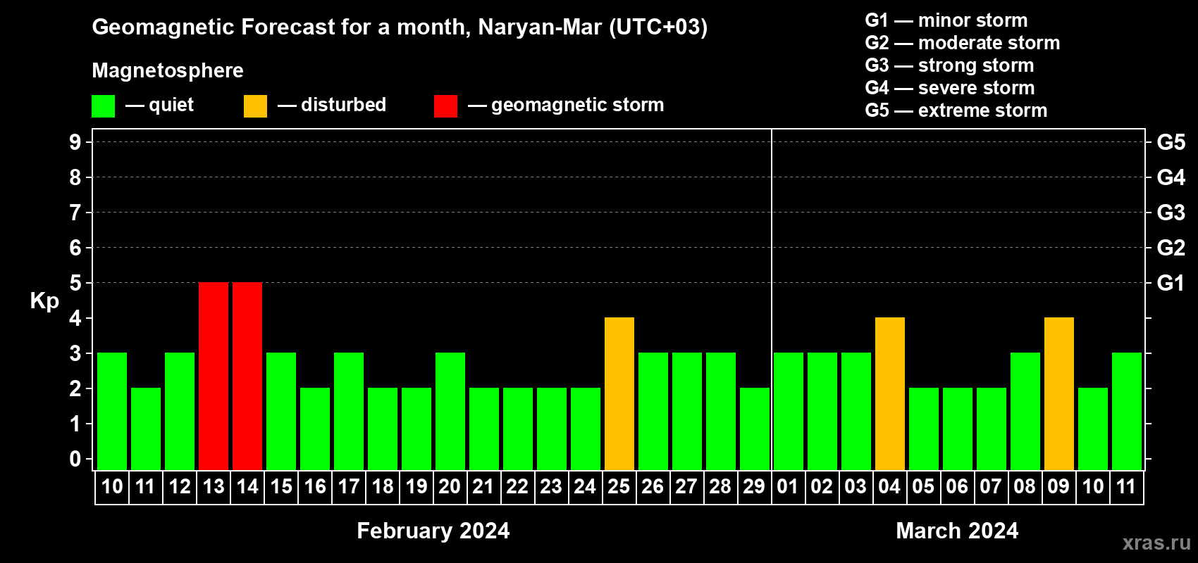 Geomagnetic activity forecast in Naryan-Mar — Feb 10, 2024